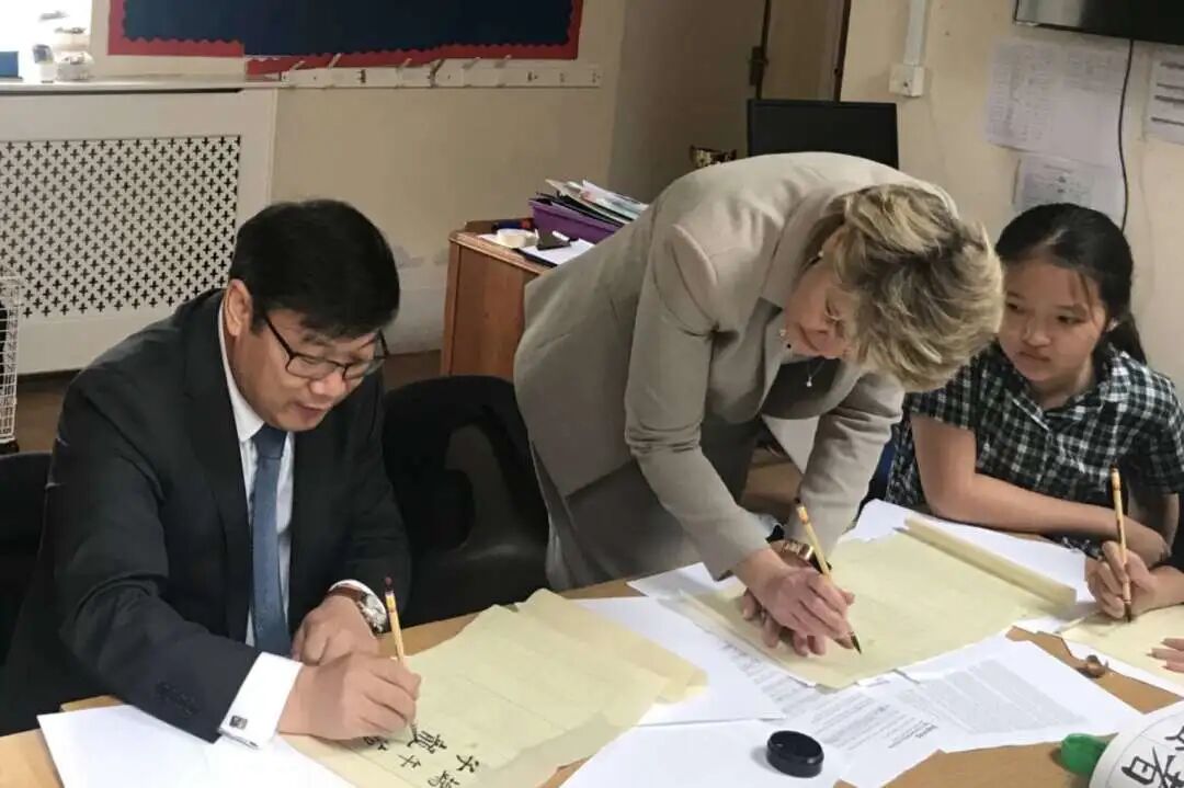 李远校长与英国阿德科特学校校长戴安参加学生的中国书法课