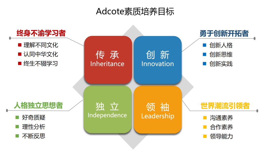 在“21世纪核心素养5C模型”基础上,提出Adcote四大素质培养目标:传承、创新、独立、领袖